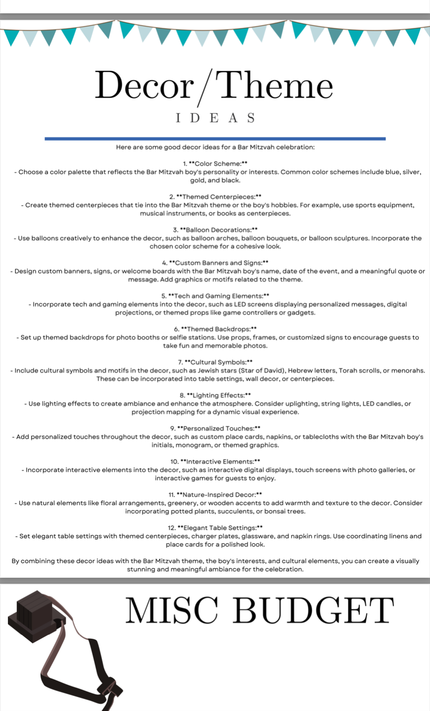 2. Guide: Access a comprehensive guide that covers every aspect of planning a Bar Mitzvah, from choosing a theme and decor to selecting vendors, creating invitations, and coordinating the ceremony and reception. Get expert tips, advice, and checklists to streamline the planning process.