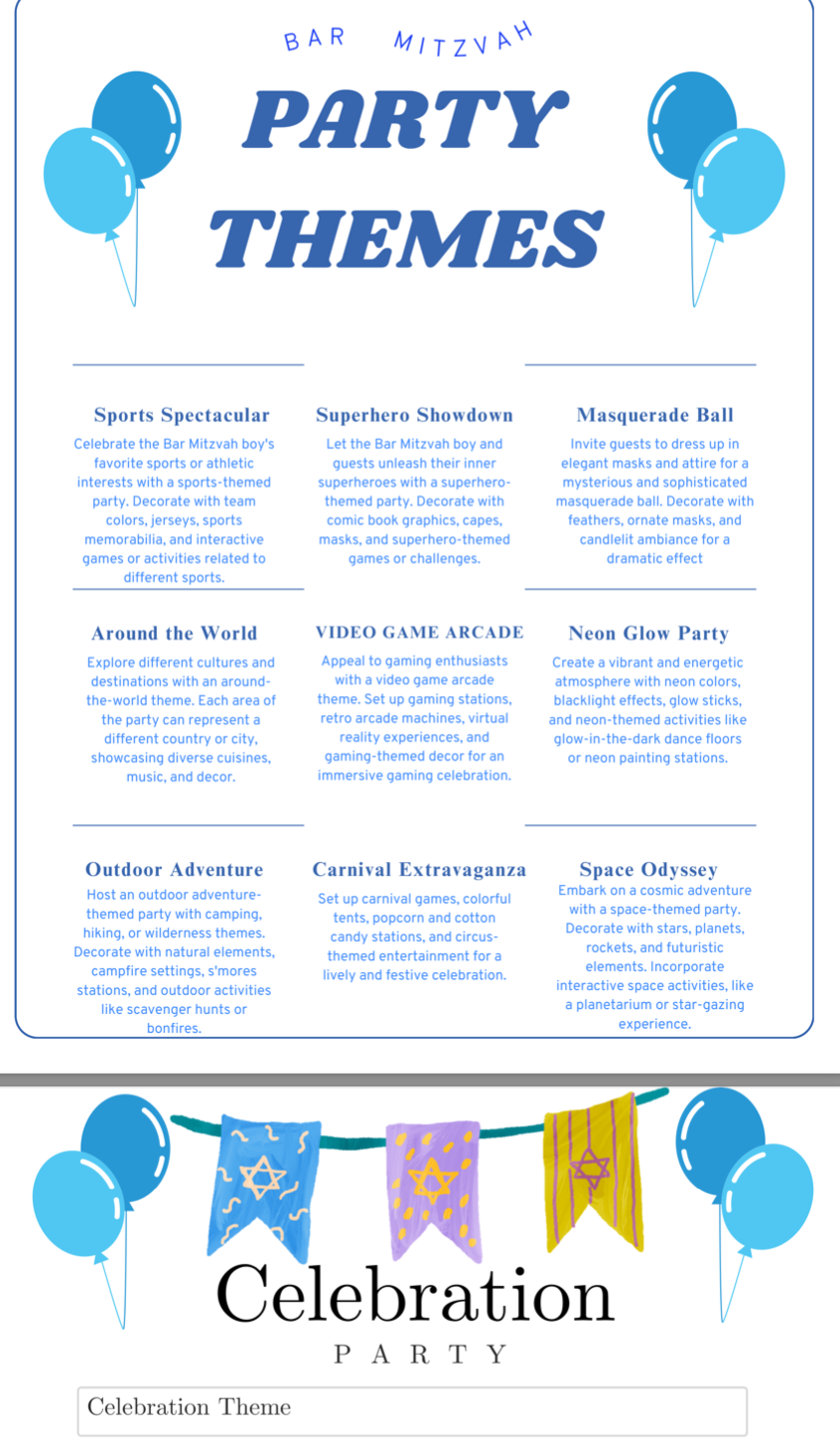 5. Party Themes and Decor Ideas: Explore a range of party themes and decor inspirations to set the tone for your celebration. From traditional and cultural themes to modern and creative concepts, discover ideas that reflect the Bar Mitzvah boy's personality and interests.